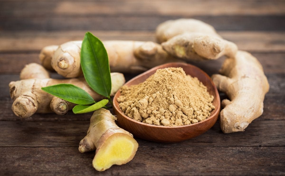 Jengibre fresco, jengibre en hojuelas y jengibre en polvo .